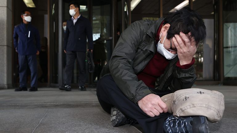 지난 11일 서초동 대법원에서 고(故) 박인근 전 형제복지원 원장에 대한 비상상고가 기각되자 법정에서 나온 형제복지원 피해자가 주저앉아 눈물을 흘리고 있다. /연합뉴스
