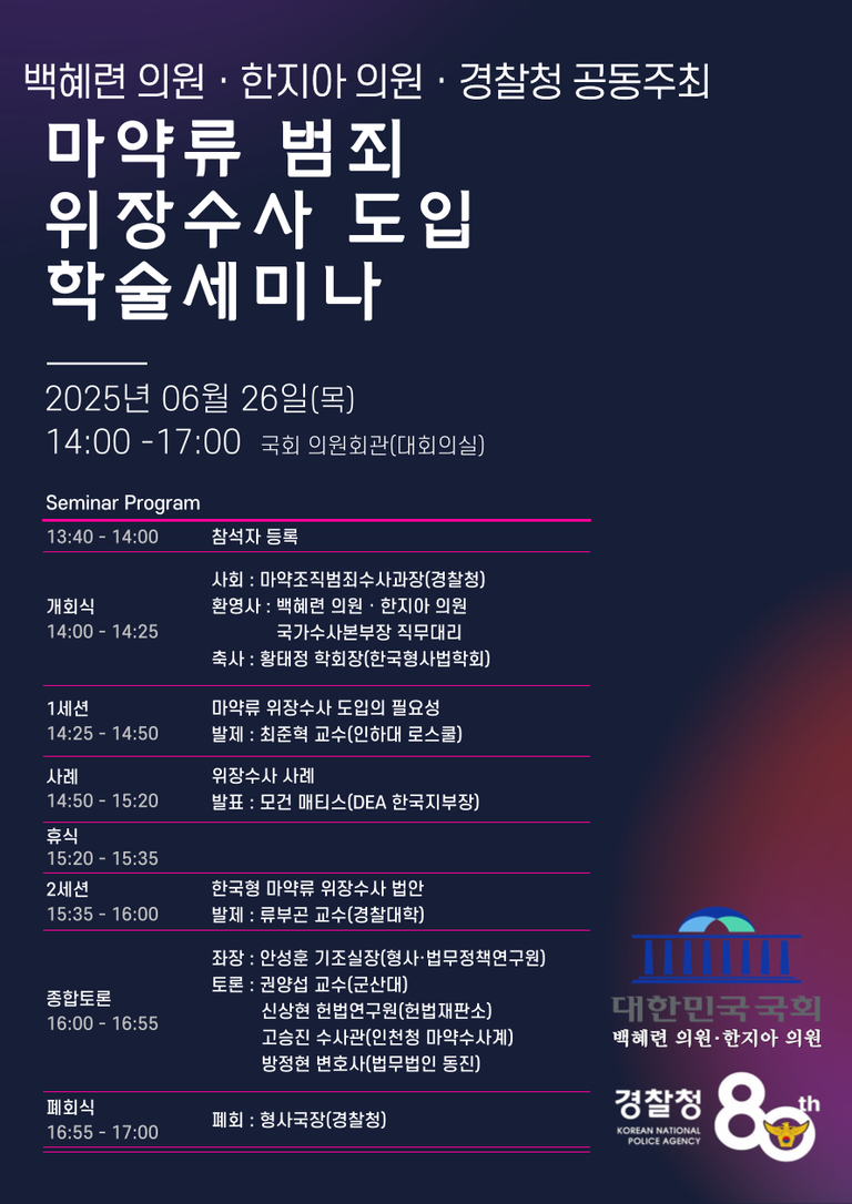 경찰청은 백혜련 의원(더불어민주당), 한지아 의원(국민의힘)과 공동으로 이날 오후 2시부터 5시까지 국회 의원회관 대회의실에서 '마약류 범죄 위장수사 도입' 학술 세미나를 진행했다고 발표했다.