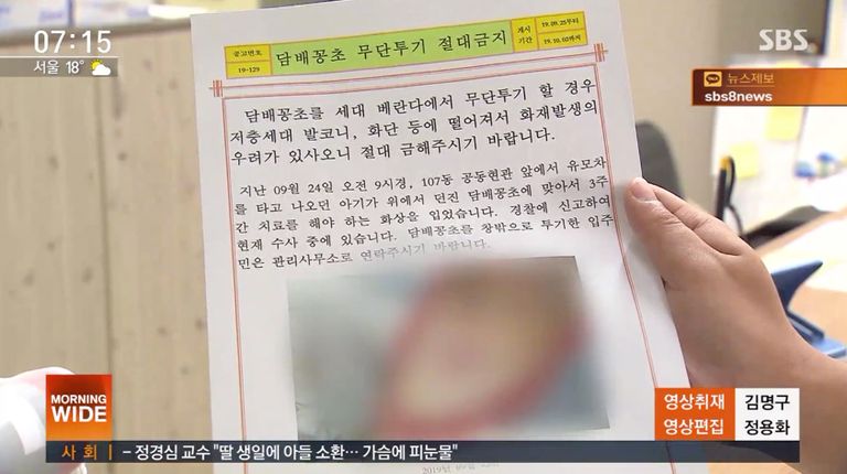 유모차 안에 있던 3살배기 아이가 하늘에서 날아온 담배꽁초에 오른쪽 어깨에 화상을 입었다. 피부 안쪽 진피까지 손상되는 2도 화상이었다. 엄마는 아파트 위를 올려다보며 “대체 누가 그런 거냐”고 소리 질렀으나 범인은 끝내 나타나지 않았다.
