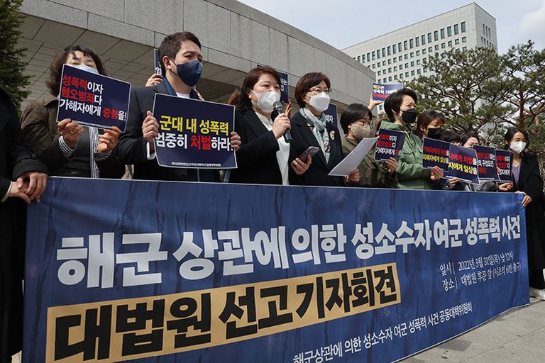 부하 여군을 상대로 성폭행한 혐의로 기소된 해군 장교 2명에 대해 대법원이 엇갈린 판결을 내놨다. 사진은 지난 31일 상고심이 끝난 뒤 '해군 상관에 의한 성소수자 여군 성폭력 사건' 공동대책위원회가 가해자에 대한 징계를 요구하는 기자회견을 하고 있는 모습. /연합뉴스