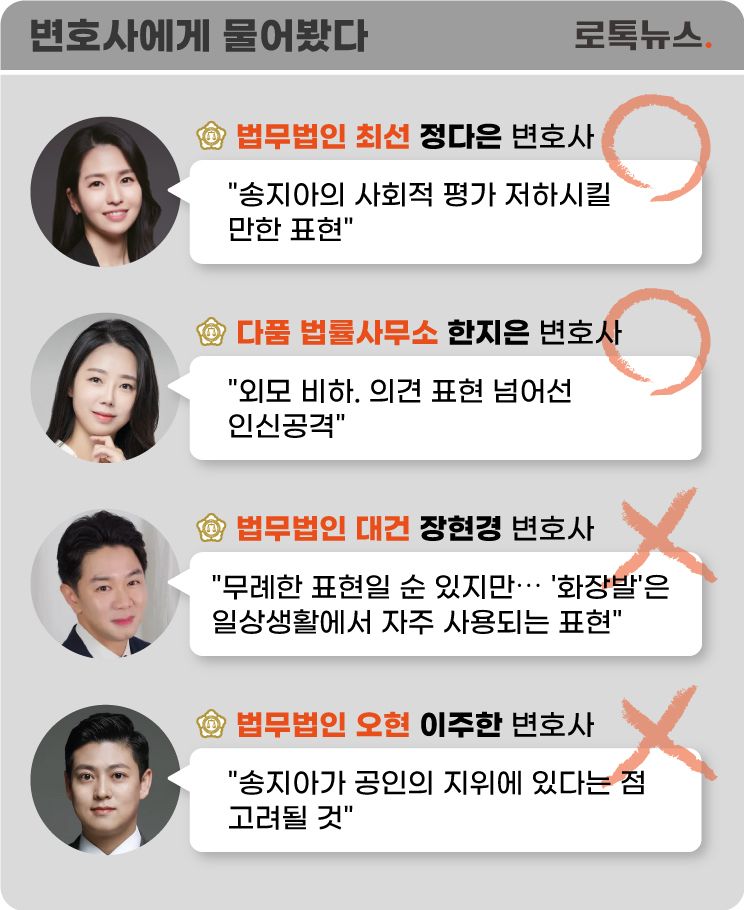 법무법인 최선의 정다은 변호사는 "송지아의 얼굴 사진을 올리며 '화장발', '조명발'이라고 표현한 건, 송지아의 사회적 평가를 저하시킬 만한 추상적 판단이나 경멸적 감정을 표현한 것으로 비춰질 여지가 있다"며 "모욕죄에 해당할 가능성이 있어 보인다"고 밝혔다.