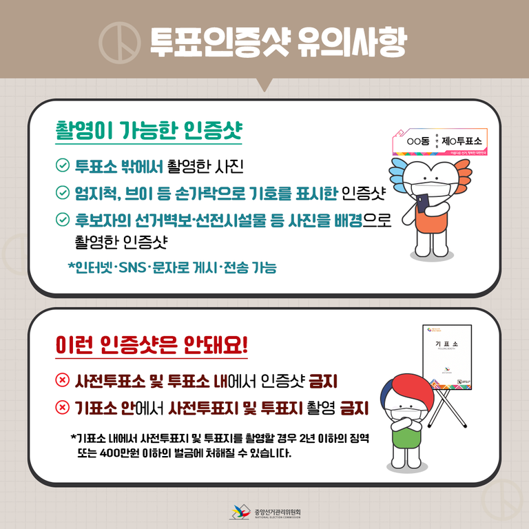 다만, 기표소 안 혹은 투표소 안이 아닌 곳에서의 인증샷은 가능하다. 이 경우 '손가락으로 기호를 표시한 인증샷'도 가능하다. 특정 후보자의 선거벽보·선전시설물 등 사진을 배경으로 투표 참여 권유 문구를 함께 적어 게시·전송하는 것도 할 수 있다.