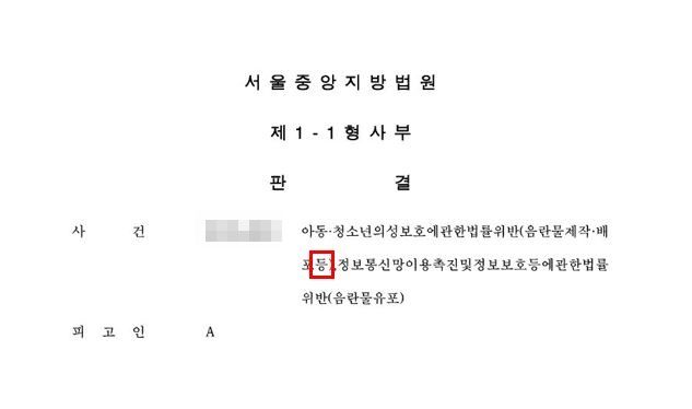 실제 '웰컴 투 비디오' 운영자 손정우 씨가 지난해 5월 받았던 2심 판결문의 일부. 죄명에 '아동⋅청소년의성보호에관한법률위반(음란물 제작⋅ 배포등)'이라고 적혀있다. 손씨 아버지는 여기서 '등'이라는 한 글자를 강조했다. /안세연 기자