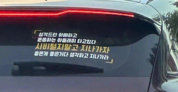 차량 뒷면에 "성격드런 아빠하고 운동하는 아들래미 타고있다. 시비 털지 말고 지나가자. 좋은 게 좋은 거라고 생각하고 지나가라"는 경고성 문구를 붙인 차량 사진이 온라인상에서 큰 논란을 낳고 있다.