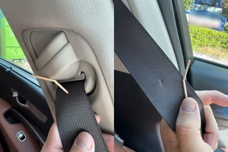 안전벨트에 이쑤시개가 꽂혀 있는 모습. /온라인 커뮤니티