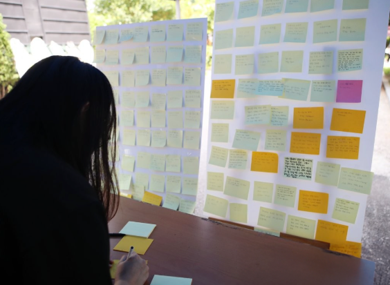 2022년 7월 18일, 인하대학교 캠퍼스에 마련된 추모 공간에서 학생이 메시지를 적고 있는 모습. /연합뉴스