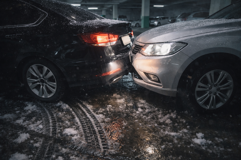 진눈깨비가 내려 미끄러웠던 한 주차장에서 앞에 있던 차가 주차를 위해 갑자기 후진하며 A씨 차량의 앞 범퍼를 들이받았다./챗 지피티 생성 이미지