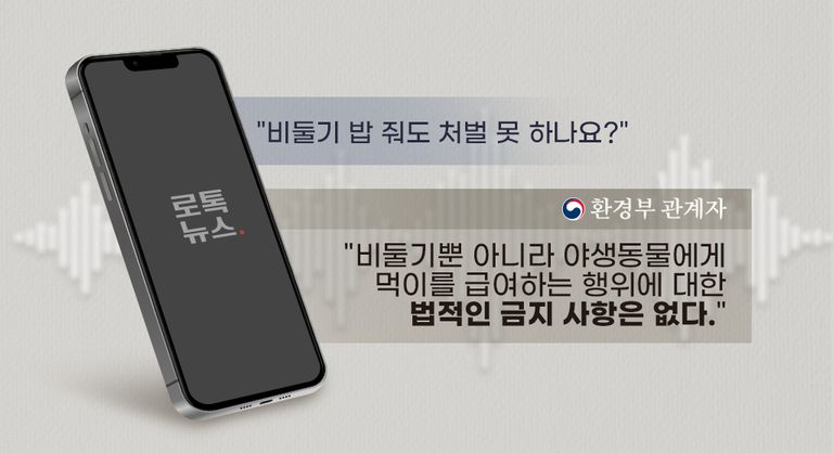 환경부 생물다양성과 관계자는 24일 로톡뉴스와의 통화에서 "비둘기뿐 아니라 야생동물에 먹이를 급여하는 행위에 대한 법적인 금지 사항은 없다"고 했다. 이에 따라 구청 등에 민원을 넣어도, 먹이 주는 사람을 법적으로 제재하기 어려운 실정이다.