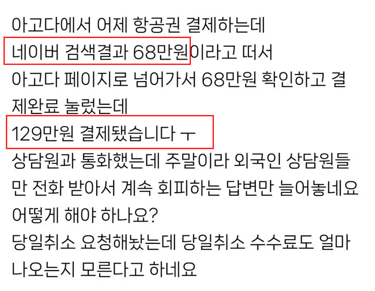 소비자 A씨는 아고다에서 68만 원으로 표시된 항공권을 확인하고 결제 버튼을 눌렀으나, 실제 승인된 금액은 129만 원이었다. 아고다 측은 초기 상담에서 환불 불가 입장을 보였으나, A씨가 결제 직전 가격이 명시된 화면 캡처본을 제시하며 국민신문고와 한국소비자원에 민원을 제기하자 결제 취소 처리를 완료했다.