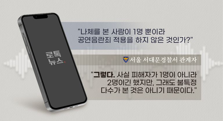 로톡뉴스는 먼저 서울 서대문경찰서 측이 정말 A씨의 나체를 본 피해자가 1명이기에 공연음란죄를 적용하지 않은 것이 맞는지, 알려지지 않은 상황 등이 있는지를 확인했다.