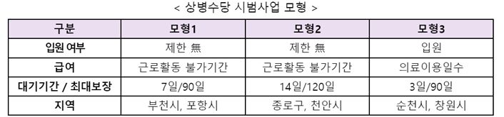 모형3은 '입원한 경우'만 대상자로 인정된다. 입원 또는 외래 진료일수만큼 상병수당이 지급되며 대기기간은 3일, 최대 보장기간은 90일이다.