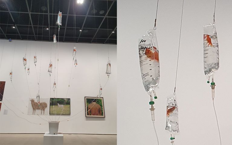 허공에 달린 링거 주머니 안에 금붕어가 들어있다. 지난달 30일부터 전남도립미술관에서 전시된 작품, 유벅 작가의 'Fish'다. "금붕어가 서서히 죽어가는 과정을 통해 인간의 내면에 있는 폭력성과 이중성을 표현했다"는 것이 작가의 설명이다.