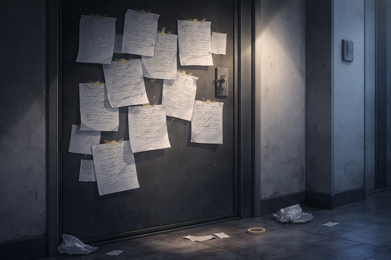 평온해야 할 집은 남편이 아내의 현관문에 벽보를 붙이기 시작하면서 공포의 공간으로 변했다.