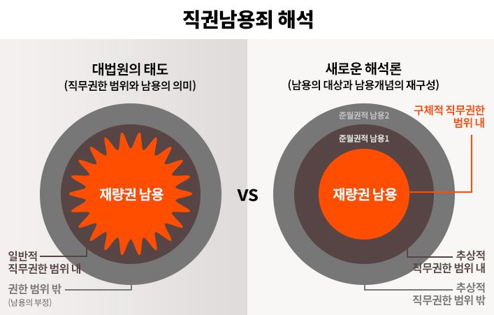 성균관대 법학전문대학원 김성돈 교수는 “그간 대법원이 주도적으로 정립해 온 직권남용죄의 해석 태도가 예측 가능성과 법적 안정성을 담보할 수 없는 방향으로 이뤄졌기 때문”이라고 분석했다.
