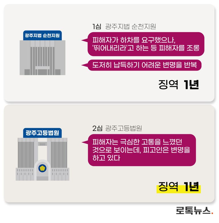 2심을 맡은 광주고법 형사 2-3부(박정훈⋅성충용⋅위광하 고법 판사)는 지난해 8월, 1심과 같이 징역 1년을 선고했다.