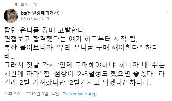 지난달 트위터에는 ‘탑텐강매피해자'라는 계정으로 여러 글이 올라왔다. 의류 업체에서 아르바이트생에게 강제로 자사 의류 2벌을 구매하도록 했다는 폭로했다. 그는 한 게시글에서 “면접에 합격한 뒤 점장에게 복장 규정을 물어보니 ‘우리 유니폼을 구매해야 한다. 2~3벌 정도 했으면 좋겠다'고 말했다"며 “2벌 골랐더니 ‘그걸로 되겠냐'고 했다"고 적었다.