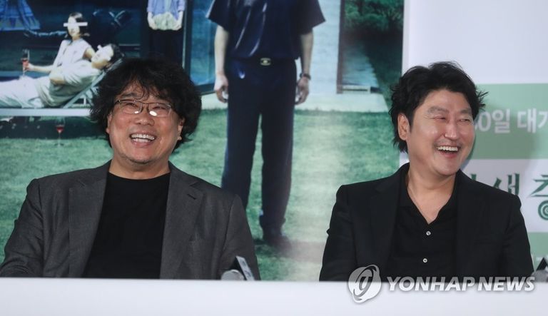 봉준호 감독과 배우 송강호가 28일 오후 서울 용산구 한강로동 CGV용산아이파크몰점에서 열린 영화 '기생충' 언론시사회 및 기자간담회에서 환하게 웃고 있다. / 연합뉴스 류효림 기자