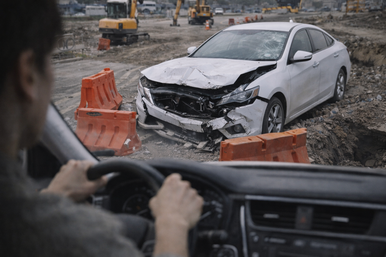 안전장치가 없는 도로 공사 현장에서 사고를 당한 운전자가 경찰의 만류로 고소를 망설였다. / AI 생성 이미지