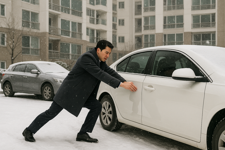 사건은 눈이 많이 내린 어느 겨울날, 아파트 1층 주차장에서 시작됐다. A씨는 정상적으로 주차된 자신의 차량 앞을 다른 차량이 연락처도 없이 가로로 막고 있는 것을 발견했다. 급한 마음에 A씨는 사이드 브레이크가 풀려있을 것으로 기대하고 차를 밀어보기로 했다.
