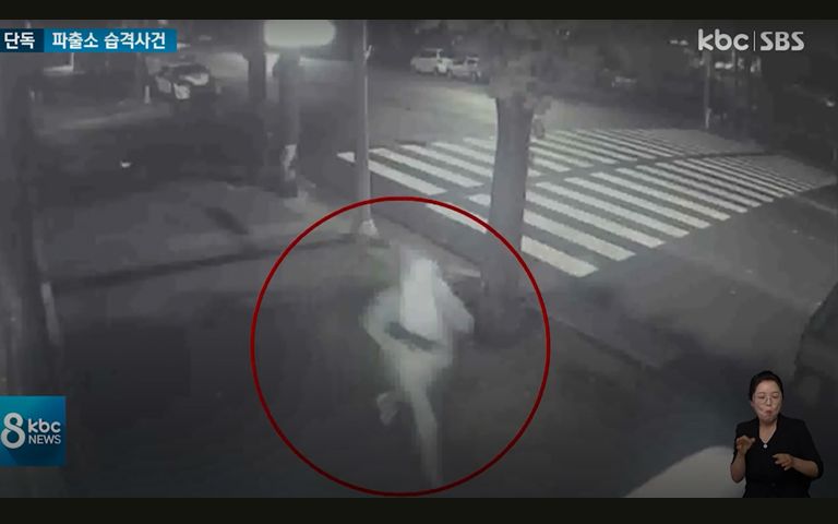 새벽 복면을 쓴 20대 남성이 파출소에 들어가 화살총을 쏘고 달아난 사건이 발생했다. 그런데 당시 파출소에 있던 경찰들이 범인을 잡기는커녕 몸을 책상 밑에 숨기고 112에 "범인을 잡아달라"고 신고를 한 것으로 드러났다. /KBC 뉴스 화면 캡처