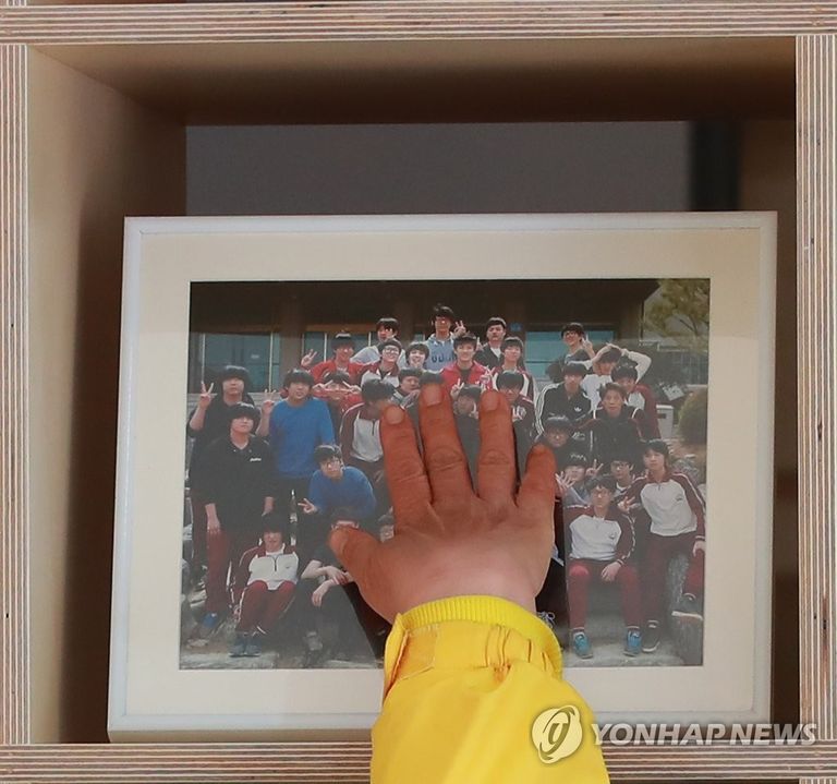 15일 '세월호참사 책임자처벌 대상 1차 발표' 기자회견 후 단원고 기념사진을 어루만지는 한 유가족=연합뉴스 홍해인 기자(C)저작권 연합