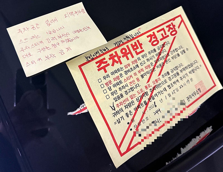 차주는 차량에 "주차 공간이 없어 외벽에 주차해 스트레스 받는다"며 "주차 스티커 강력 부착 시 대법원 판례대로 구상권을 청구하겠으니 부착을 금지한다"는 경고장을 남겼다. 하지만 해당 아파트 경비원은 이에 지지 않고 "불법 주차면 경고장을 발부한다"고 맞받아쳤다.