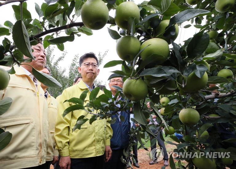 태풍 대비 및 추석 성수품 수급상황 점검에 나선 김현수 농림축산식품부 장관이 4일 충남 예산군 신암면 한 사과농장에서 사과 상태를 점검하고 태풍 대비 대책을 논의하고 있다. / 저작권자 (C) 연합뉴스