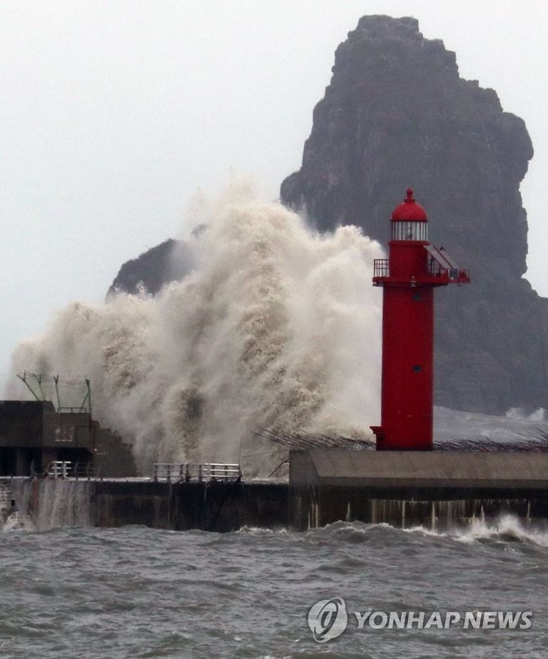 지난해 10월 태풍 '콩레이'가 부산 오륙도 방파제에 거센 파도를 불러일으키고 있다. / 저작권자 (C) 연합뉴스