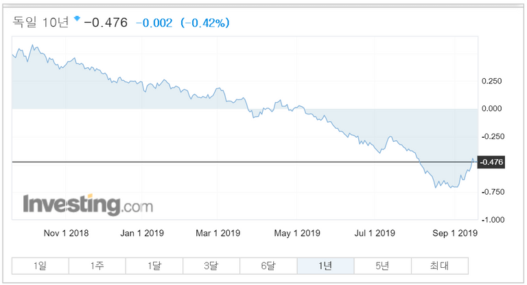 독일 10년 만기 국채 등 채권 금리 추이. 2019년 9월 18일 오후 기준으로 -0.476%를 기록하고 있다. /Investing.com