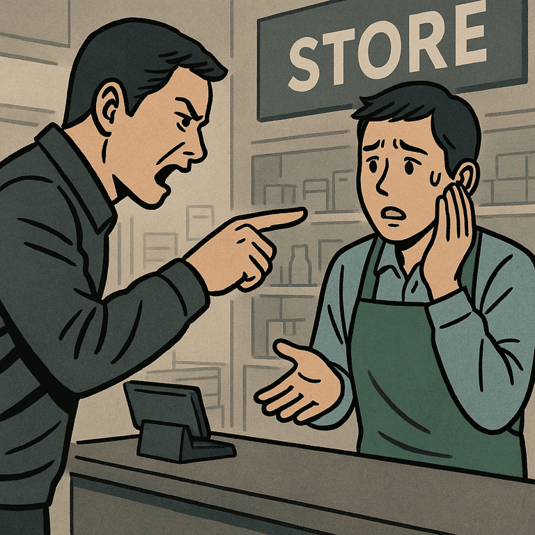 A씨의 가계에 찾아온 한 고객이 부당한 할인을 요구하며 거친 말로 압박하고 있다. /챗 지피티 생성 이미지