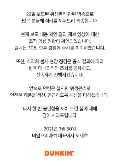 30일 비알코리아는 던킨 홈페이지에 "위생관리 관련 방송으로 많은 분들께 심려를 끼쳐드려 죄송하다"면서도 "현재 보도 내용 확인 결과 조작 의심 정황이 확인됐다"고 했다.