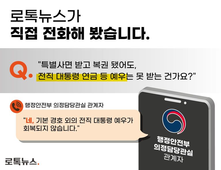 이러한 사실은 전직대통령법을 관할하는 행정안전부 의정담당관실을 통해서도 확인할 수 있었다. 24일, 행정안전부 관계자는 로톡뉴스와 통화에서 "특별사면과 복권을 받은 경우라도 (박 전 대통령의) 예우가 회복되지 않는다"고 답했다.