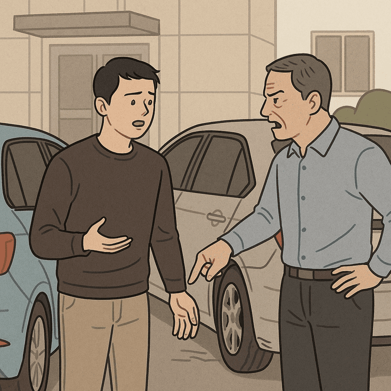 아버지 차로 후진 중 경미한 접촉사고를 낸 A씨는 무보험 운전자로, 75만원 합의와 100만원 벌금 사이 '딜레마'에 빠졌다. /챗 지피티 생성 이미지