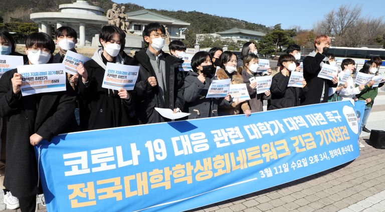 전국대학학생회네트워크 회원들이 11일 청와대 앞 분수대에서 대학가 코로나19 대책 촉구 기자회견을 하고 있다. /연합뉴스