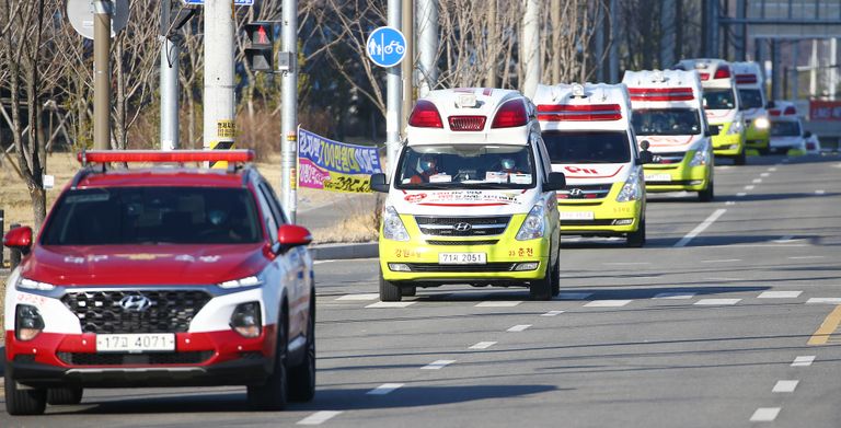 [긴급이송 위해 출동하는 앰뷸런스] 23일 대구시 달성군 구지면 중앙119구조본부에서 119 구급대 앰뷸런스들이 신종 코로나바이러스 감염증(코로나19) 확진자 이송을 위해 확진자가 있는 대구 시내 각 지역으로 출동하고 있다. 중앙119구조본부는 대구에서 확진자가 무더기로 늘어남에 따라 전날부터 전국 시·도에서 18대의 앰뷸런스를 차출해 환자이송에 나서고 있다. /연합뉴스