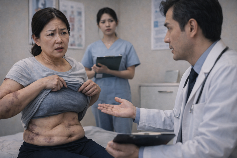910만 원을 들여 지방흡입 수술을 받은 여성이 심각한 피부 처짐 등 부작용을 겪고 있지만, 병원 측은 무책임한 태도로 일관했다. / AI 생성 이미지
