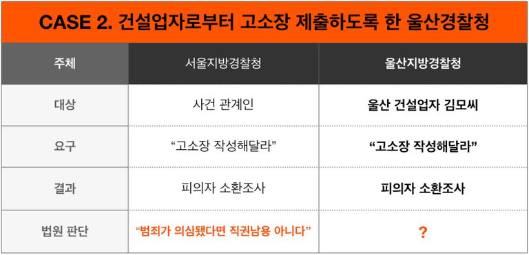 울산의 한 건설업자에게 고소장을 제출하도록 요구한 경찰청, 직권남용죄에 해당할까? 가이드라인의 사례 중 하나와 비교해봤다. /그래픽 편집=엄보운 기자