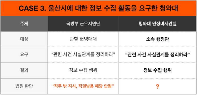 행정관을 보내 울산시에 대한 정보 수집 활동을 요구한 청와대, 직권남용죄에 해당할까? 가이드라인의 사례 중 하나와 비교해봤다. /그래픽 편집=엄보운 기자