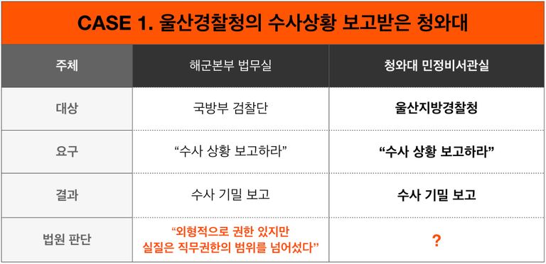 외형적으로 청와대는 울산경찰청으로부터 수사 상황을 보고받을 권한이 있다. 하지만 보고 내용 중에 수사기밀사항이 있었다면 '해군본부 법무실장' 사건과 동일하게 "그 실질은 일반적 직무권한 범위를 넘어섰다"는 법원 판단이 나올 여지가 있다. 기밀이 유출되면 수사에 장애가 초래되는 것은 똑같기 때문이다.
