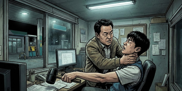 목 졸린 주유소 직원이 고무망치를 휘둘렀지만, 법원은 생명 위협 상황에서의 단 1회 타격을 정당방위로 인정해 무죄를 선고했다. /본문의 이해를 돕기 위해 생성형 AI로 만든 이미지