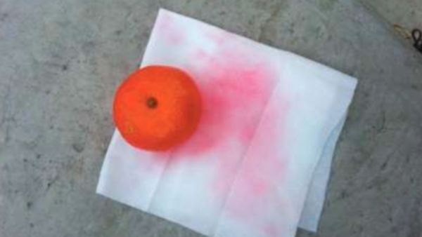영상에서 귤은 겉보기엔 문제가 없었다. 하지만 귤껍질을 닦아보니 휴지가 새빨갛게 물들었다. 물로 씻어보자 이번엔 물이 빨간색으로 물들었다. 파 역시 마찬가지였다. 색소의 색깔만 청록색이었다.