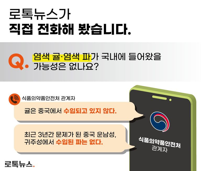 로톡뉴스는 수입식품의 위해(危害) 정보를 관리하고 있는 식품의약품안전처(식약처)에 문제가 된 염색 귤, 염색 파가 국내로 수입됐을 가능성이 있는지에 대해 물었다.