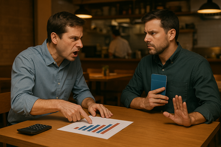 친구와 동업한 음식점의 매출이 2배로 뛰었지만, 친구는 수익이 없다며 통장 공개를 거부해 갈등이 생겼다./챗 지피티 생성 이미지