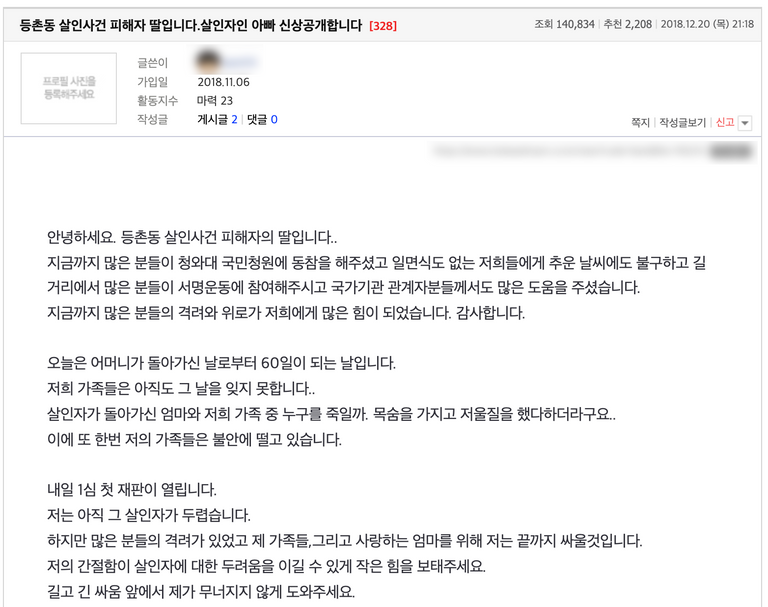 "등촌동 살인사건 피해자 딸입니다. 살인자인 아빠 신상공개합니다"