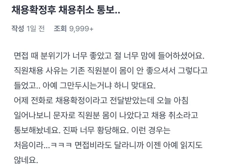 회사로부터 채용확정 통보를 받은 뒤 취소됐다면 단순 변심이 아닌 ‘부당해고’에 해당할 수 있다. 온라인 커뮤니티에 게시된 합격 후 채용 취소 통보를 받았다는 게시물. /온라인 커뮤니티