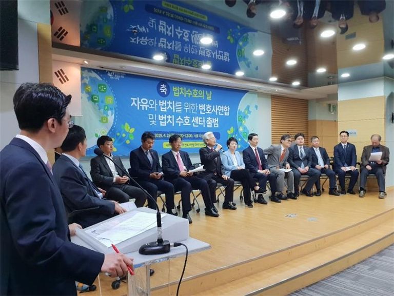 같은 시간에 서울지방변호사회관 지하 1층 회의실에서는 보수 성향의 법률가들이 모여 ‘자유와 법치를 위한 변호사연합’을 결성하고 ‘법치수호 센터’를 출범시켰다.