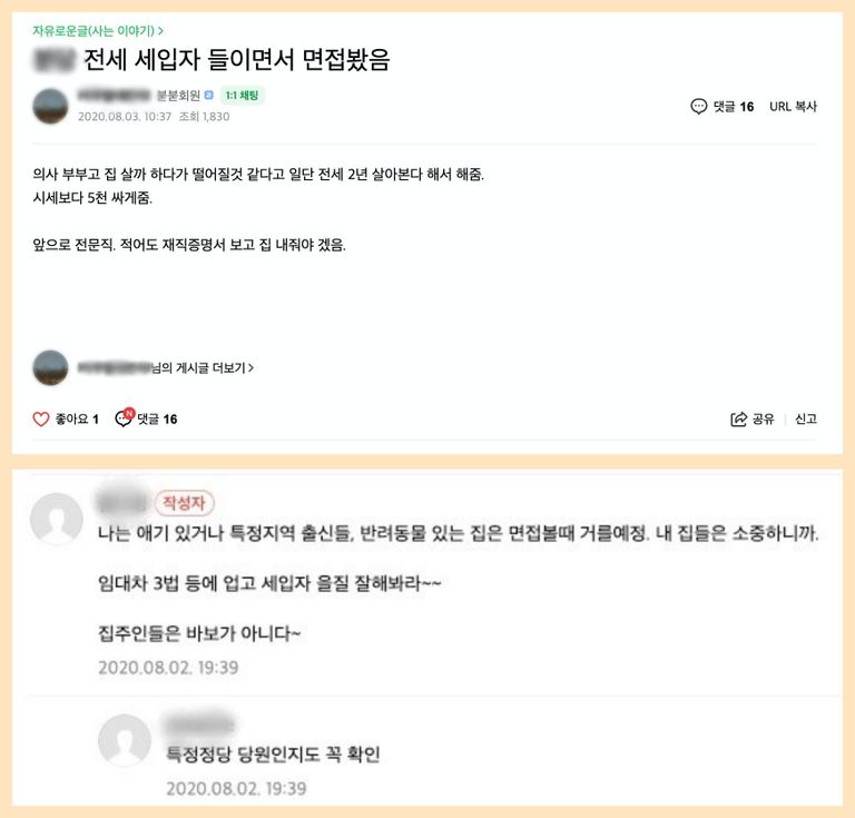 공유되고 있는 질문지에는 임대 리스크를 줄이기 위한 집주인의 고민이 그대로 반영되어 있었다. 반려동물이나 어린 자녀 유무 등 직접 관련된 질문도 있었지만, 정치 성향 등 무관한 질문도 있었다.