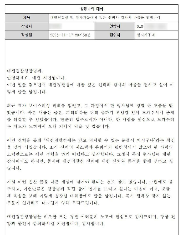 피해자 A씨는 피해금을 모두 돌려받자 지난달 대전경찰청 누리집 '청장과의 대화' 게시판에 경찰에 대한 감사의 글을 게시했다.