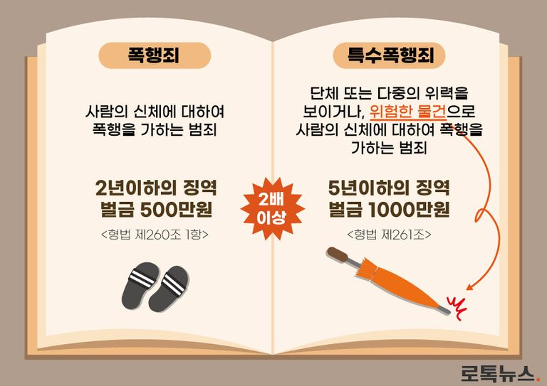 일반 폭행은 2년 이하의 징역 또는 500만원 이하의 벌금이지만, 특수폭행은 5년 이하의 징역 또는 1000만원 이하의 벌금이다.