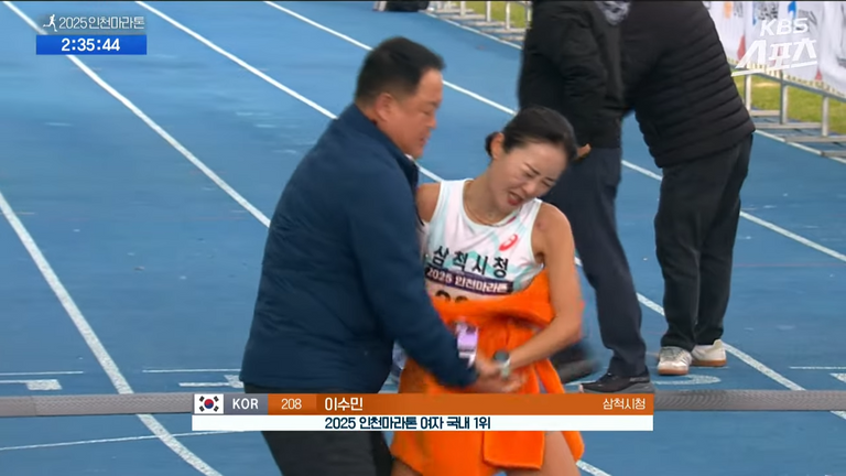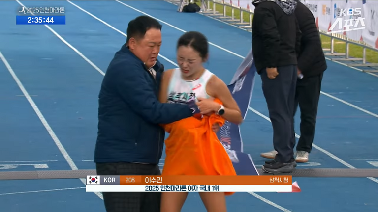2025 인천마라톤에서 이수민 선수가 국내 여자부 1위로 결승선을 통과하자, 김완기 감독이 타월로 이수민 선수의 상체를 감싸는 모습. /'KBS 스포츠' 유튜브 캡처